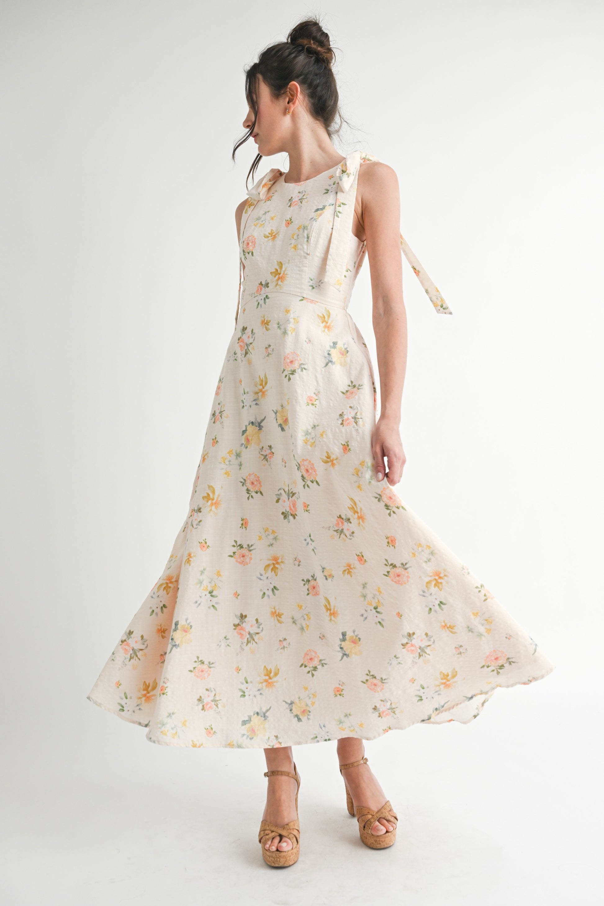 Floral printed sleeveless shoulder bow detail maxi dress. Back invisible zipper. Lining.